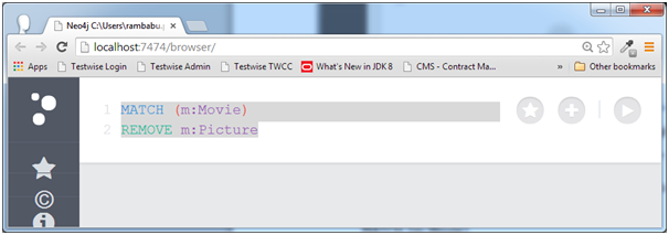 Neo4j CQL - REMOVE - tutorialspoint.com This example demonstrates how to remove an unwanted label to a Node permanently from the Database. Step 1 - Open Neo4j Data Browser. Step 2 - Type the below command on Data Browser. MATCH (m:Movie) RETURN m. Step 3 - Click on "Execute" button and observe the results. Step 4 - Click on node to see its properties window.